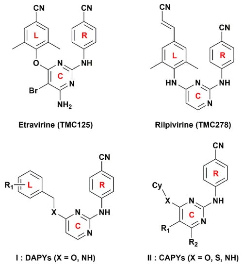 Structures of diarylpyrimidines (DAPYs) and cycloalkyl arylpyrimidines (CAPYs). The DAPYs scaffold includes a left wing (L), a right wing (R), a central pyrimidine ring (C), and the linkers.