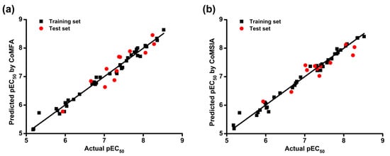 Scatter pot of actual against predicted pEC50 values. (a) CoMFA model; (b) CoMSIA model.
