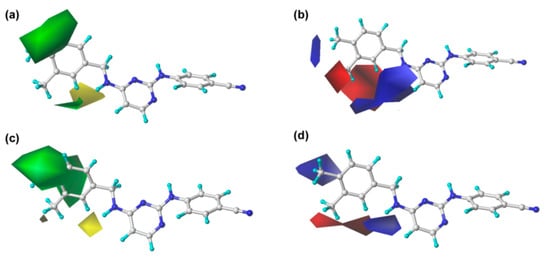 The contour maps of the steric and electrostatic fields in combination with compound 43. Steric fields: favored (green) and disfavored (yellow). Electrostatic fields: electropositive (blue) and electronegative (red). (a,b) CoMFA model; (c,d) CoMSIA model.