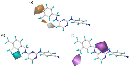 The CoMSIA contour maps in combination with compound 43. (a) Hydrophobic fields: hydrophobic (orange) and hydrophilic (white). (b) Hydrogen-bond donor fields: favored (cyan) and disfavored (purple, not present). (c) Hydrogen-bond acceptor fields: favored (green, not present) and disfavored (violet).