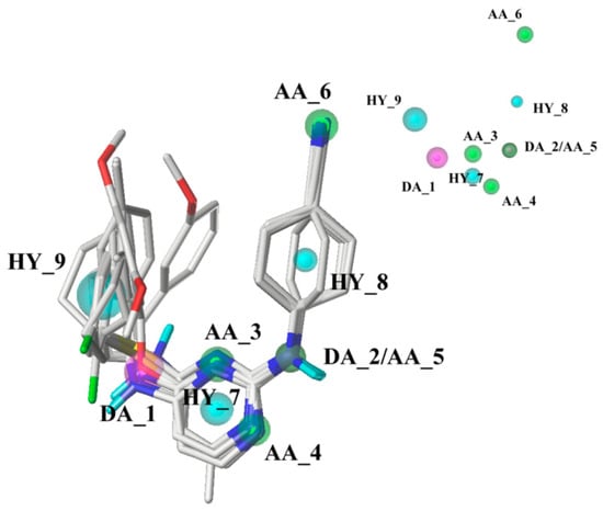 The pharmacophore model with the alignment of nine training set compounds. The magenta, green, and cyan spheres represent hydrogen-bond donor atoms (DAs), hydrogen-bond acceptor atoms (AAs), and hydrophobes (HYs), respectively.