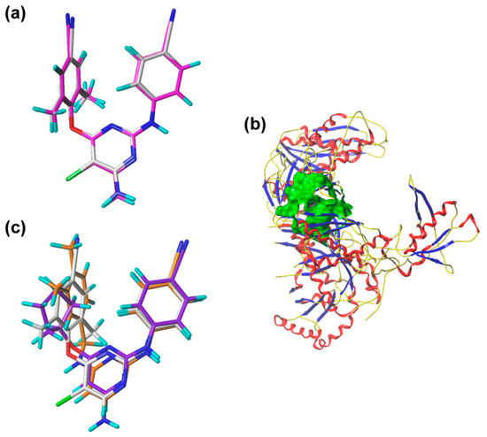 To validate the docking reliability, a cognate ligand, i.e., etravirine, which was extracted from the crystal structure of the WT HIV-1 RT (PDB ID: 3MEC), was first re-docked into the binding site using surflex-docking. The redocked conformation was compared with the original crystallographic conformation of the ligand [14]. As shown in Figure 6a, the redocked etravirine and the crystal etravirine in the complex are almost completely superimposable, and the root-mean-square deviation (RMSD) of the two conformations for all atoms is 0.25 Å. These results suggest that the surflex docking method and the used parameters are reasonable and reliable [15]. The DAPYs and CAPYs were then docked into the binding site in the same way. The generated binding pocket is shown in Figure 6b.