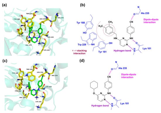 Docking results of compounds 43 (a) and 46 (c) in the nonnucleoside binding site of human immunodeficiency virus type 1 (HIV-1) reverse transcriptase (RT). Hydrogen bonds are shown as yellow lines, and compounds 43 and 46 are represented as green sticks. The schematic diagram of the interacting modes for compound 43 (b) and 46 (d), respectively.
