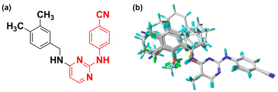Compound 43 was used for the alignment of all molecules. (a) The structure of compound 43 corresponding to the common scaffold is in red; (b) Alignment of the training set compounds.