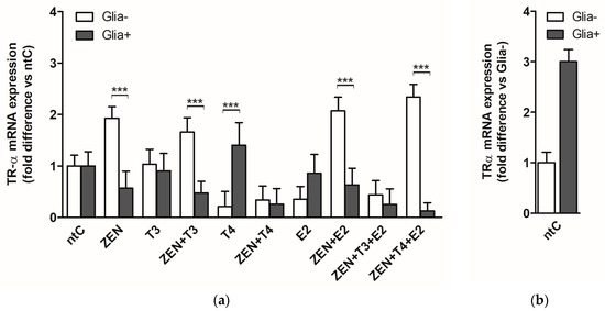 Considering the two primary culture systems, TRα mRNA levels altered significantly in Glia− cultures compared to Glia+, with a significant increase in Glia− following ZEN treatment (p < 0.001). High expression of TRα mRNA was observed in the case of ZEN used in combination with T3, E2, and T4 + E2 in Glia−. A reverse expression pattern was observed in the case of T4 treatment resulting in elevated mRNA levels in the Glia+ compared to the low levels of mRNA detected in the Glia− (p < 0.001).