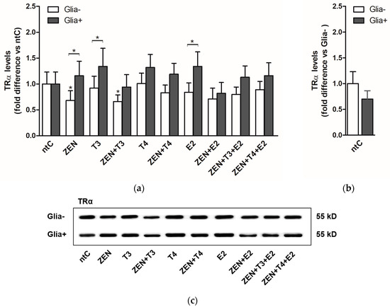 It has been shown that TRα is the most abundant thyroid receptor in the developing brain and the two receptors are highly heterogeneous in their expression throughout the different brain regions. These changes might be also reflected in their responsiveness in our experimental system since TRβ expression was not influenced by ZEN at mRNA level opposite to TRα expression. Interestingly, the lack of TRβ mRNA expression was contravened at protein level since a small but significant increase in TRβ protein expression was induced by ZEN, suggesting the increased expression and functionality of TRβ in mature cerebellar neurons [80]. This was also reflected by the significant increase of TRβ protein levels induced by T3, T4, and E2. It should be noted that the increased protein levels caused by ZEN and hormones were only observed in the presence of glia, proving their modulatory effect, and in part, explaining the TRβ expression in response to T4; however, a direct modulation of TRs by T4 was also proposed by other studies [81]. Both TRα and TRβ receptors have been identified in different types of astroglia and microglia [33,82] and their differential expression might also contribute to the increased protein expression observed in Glia+ cultures.