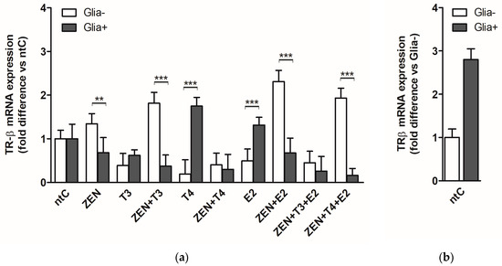TRβ mRNA expression in cerebellar granule cells in the absence, Glia−, or presence of glial cells, Glia+; treated with zearalenone (ZEN), and/or triiodo-thyronine (T3), thyroxine (T4) and 17β-estradiol (E2) for 6 h. (a) Relative expression level of the TRβ gene was analyzed by qRT-PCR and normalized to the average of the control gene β-actin. Shown p-values were calculated: Glia+ compared to Glia− (**) p < 0.01, (***) p < 0.001 in each treatment group; (b) Relative expression of TRβ mRNA in non-treated controls normalized to β-actin (p-value not shown). The data shown here are the mean ± SD of at least three independent experiments (n = 6 per treatment).