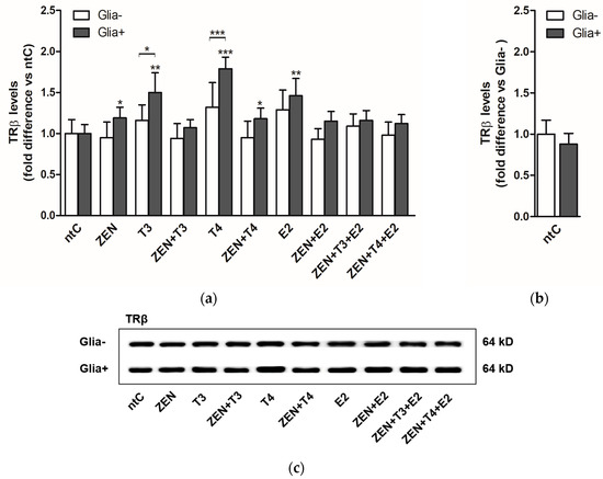 TRβ protein expression levels in cerebellar granule cells in the absence, Glia−, or presence of glial cells, Glia+; treated with zearalenone (ZEN), and/or triiodo-thyronine (T3), thyroxine (T4) and 17β-estradiol (E2) for 18 h, examined by Western blotting. (a) Shown P-values were calculated: compared to ntC (above and next to the bars) and Glia+ compared to Glia− (*) p < 0.05, (**) p < 0.01, (***) p < 0.001 (above braces) in each treatment group; (b) Expression of TRβ protein in non-treated controls normalized to Glia− (p-value not shown). All data represents the mean ± SD of at least three independent experiments (n = 6 per treatment); (c) Representative Western blot images.