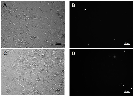 PI staining was used to evaluate cell viability following ZEN treatment. (A,B) Non-treated, Glia+ control group, (C,D) ZEN treated Glia+ group. PI positive cells were detected by fluorescence microscopy using a Texas red filter set.