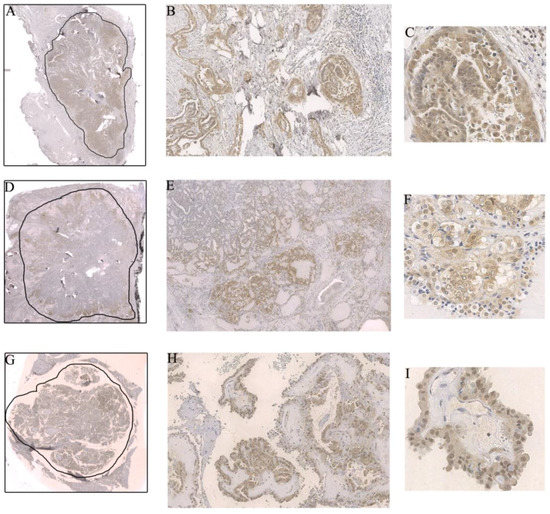 (A–C) Intensification of the immunostaining and phospho-AKT Ser473 nuclear expression in the invasive front of a classic papillary thyroid carcinoma (cPTC); (A) 0.44×, (B) 10×, and (C) 40× magnification; (D–F) Preferential phospho-AKT Ser473 expression in the tumor periphery, another example in a cPTC. Notice that, in this case, the nuclear translocation was not so intense compared to the previous one; (D) 0.44×, (E) 4×, and (F) 40× magnification; (G–I) Strong and disseminated phospho-AKT Ser473 nuclear expression in a hobnail variant of papillary thyroid carcinoma (PTC); (G) 0.44×, (H) 10×, and (I) 40× magnification. The drawn lines, at 0.44× magnification (Figure 1A,D,G), circumscribe the tumor.