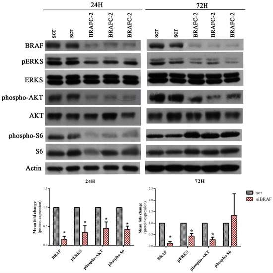 BRAF, pERKS, ERKS, phospho-AKT Ser473, AKT, phospho-S6 Ser235/236, and S6 expression in the K1 cell line after BRAF silencing. Western blot for BRAF, pERKS, ERKS, phospho-AKT Ser473, AKT, phospho-S6 Ser235/236, S6 expression and actin in K1 cell line treated with BRAF-C2 siRNA (50 nM) after 24 and 72 h. The levels of BRAF were analyzed for control of silencing efficiency and the levels of pERKS as a readout of MAPK pathway activity. Representative actin expression pattern is shown. Protein level, in scramble siRNA treated cells, was evaluated in duplicate (Scr), whereas in BRAF siRNA treated cells, it was analyzed in triplicate. The graphics depicts the mean fold change of protein expression observed in K1 cell line treated with BRAF-C2 siRNA in comparison to cells treated with scramble siRNA. Phosphorylated proteins were normalized by the levels of their correspondent total proteins, all others were normalized by the levels of control protein (actin). Results are shown as mean expression value of two independent experiments ±SEM. * p < 0.05 (unpaired Student’s t test).
