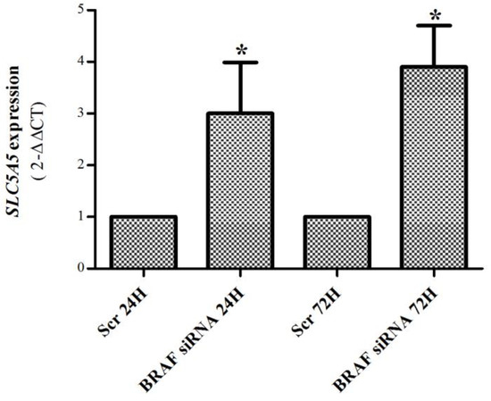 SLC5A5 mRNA expression in K1 cell line after BRAF silencing (50 nM, 24 and 72 h). BRAF silencing caused a significant (~3 fold) increase in SLC5A5 mRNA expression at both time points. Bars represent mean expression ± SEM. * p < 0.05. Results are shown as mean expression values of two independent experiments, each one with three replicates.