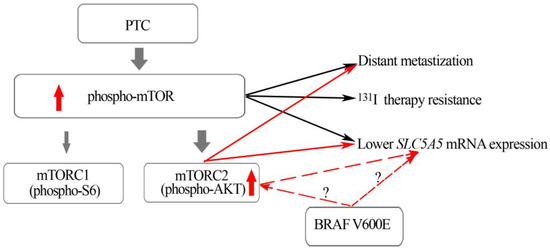 mTOR can be found in two distinct complexes: mTORC1 and mTORC2, each one with different downstream effectors, pS6 and pAKT, respectively. In PTCs, MTOR activation (high phosphor-mTOR expression) and the mTORC2 downstream effector (nuclear phospho-AKT Ser473) are associated with aggressive features (distant metastization). PTCs harboring BRAFV600E also present higher levels of pAKT. The impact of BRAF V600E on SLC5A5 mRNA expression can be direct or mediated by activation of pAKT. The red dotted arrows refers to different possibilities.