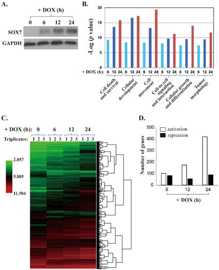 We reported a tumor suppressive role of SOX7 and its downregulation by DNA methylation in breast cancer []. However, the target genes of SOX7 have not been well studied. To characterize the SOX7 target gene profile, we generated a DOX-inducible expression system for SOX7 in MDA-MB-231 cells and collected cells for total RNA extraction at time points of 0, 6, 12 and 24 h after DOX addition to 1.0 μg/mL, which covered early and late responsive genes to SOX7 expression. We validated induced SOX7 expression at these time points by Western blot analysis and observed a steady increase of SOX7 protein (Figure 1A). The collected RNA samples were analyzed by the Affymetrix Human Genome U219 Array strips and the gene expression data at 6, 12 and 24 h time points were normalized against the control (0 h). We detected highly significant changes in the expression of genes from different ontological categories (Figure 1B). Importantly, the genes involved in many essential cancer-related processes, such as cell death, survival, growth, proliferation and tumor morphology, showed remarkable alterations, strongly suggesting that SOX7-mediated gene transcription plays an essential role in oncogenesis. The detailed signaling pathways analyzed by the Kyoto Encyclopedia of Genes and Genomes (i.e., KEGG database) and altered regulatory genes affected by SOX7 induction are shown in Figure S1. The gene expression dataset of this microarray study is available in the Gene Expression Omnibus (GEO) with an access number of GSE111122. Based on the microarray data, we generated a heat map through hierarchical clustering for genes with altered expression in MDA-MB-231 cells with DOX-induced SOX7 (Figure 1C). Overall, based on this heatmap, we observed that most of the affected genes showed monotonically increased expression with SOX7 induction (green to black to red changes, from left to right, Figure 1C), suggesting that more genes were stimulated than repressed. At 6, 12 and 24 h after DOX addition, the numbers of genes upregulated by 2.0 or more folds are 102, 174 and 420, respectively, while the numbers of genes downregulated at least 2.0-fold are 83, 56 and 89, respectively (Figure 1D). The information of these genes, including gene names, NCBI accession numbers, the fold of changes, p values, etc., are listed in Table S2. The results that more genes were activated than repressed in our microarray data were consistent with a previous study showing that SOX7 possesses a transactivation domain but lacks any well-defined transrepression domain []; consistently, the effects of SOX7 on the expression of its target genes reported in literature are mostly activating [,,,].