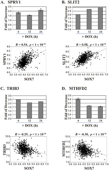 The fold changes and correlation coefficients of four SOX7 potential target genes. (A–D) Four SOX7 target genes SPRY1, SLIT2, TRIB3 and MTHFD2, respectively, were selected based on the fold changes at the 3 time points in the SOX7-U219 dataset (upper panels) and the correlation coefficients in the BrCa759 dataset (lower panels; Log2 signal intensity). The coefficients and p values for the correlation are labeled.