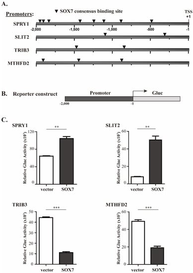 Reporter assays to examine SOX7 effects on the transcription mediated by different promoters. (A) Predicted SOX7 consensus sites (pointed by ▼) on the promoters of its potential target genes based on the Tfsitescan []. The first nucleotide of a transcription start site (TSS) is designated as “+1”, and the first nucleotide downstream TSS is “−1”. (B) Schematic diagram of a reporter construct with a 2 kb promoter driving the expression of Gluc. (C) Effects of ectopic SOX7 expression on the Gluc expression driven by the promoters of SPRY1, SLIT2, TRIB3 and MTHFD2, respectively. ** as p < 0.01, *** as p < 0.001.