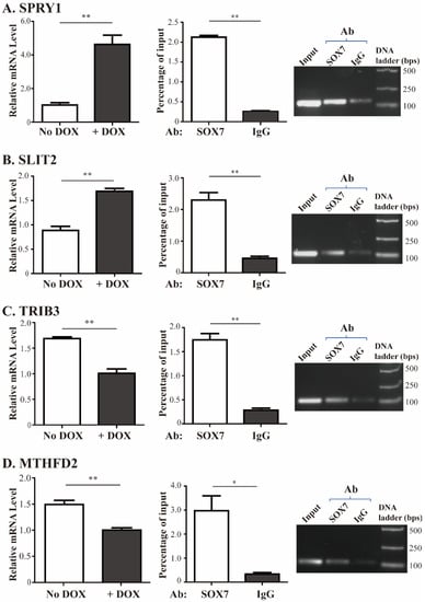 To validate the results from the SOX7 microarray dataset, we used quantitative RT-PCR to determine the changes of endogenous SPRY1, SLIT2, TRIB3 and MTHFD2 gene expression in MDA-MB-231 cells with DOX-induced SOX7. DOX was added to the medium of MDA-MB-231 cells with DOX-inducible SOX7. After 48 h we collected the cells and extracted total RNA, followed by reverse transcription and quantitative PCR for the four genes. Consistent with the microarray results, SOX7 induction led to increased expression of SPRY1 and SLIT2 (by 4.5- and 1.9-fold, respectively, Figure 4A,B, left panels), and reduced expression of TRIB3 and MTHFD2 (by 1.7- and 1.5-fold, respectively, Figure 4C,D, left panels). CDH5 is one of previously identified SOX7 target genes [], and it was activated by 3.88-fold at 24 h time point after SOX7 induction. We validated its upregulated by RT-qPCR (Figure S2). To determine whether SOX7-mediated gene expression is independent of cell lines, we tested two additional breast cancer cell lines, MDA-MB-453 and MCF-7, and found that the four potential SOX7 target genes identified in MDA-MB-231 cells also showed corresponding up- or downregulation in response to ectopically expressed SOX7 in these two cell lines (Figure S3B,C).