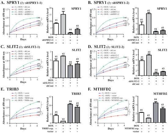 The examination of SOX7 target genes for their roles in SOX7-suppressed cell proliferation. Lentiviruses carrying shRNAs infected MDA-MB-231 cells with DOX-inducible SOX7, ectopically expressed coding sequences, or an empty vector, as labeled, and cultured in the absence or presence of DOX (i.e., −DOX and +DOX, respectively). WST-1 assays determined cell proliferation, and quantitative RT-PCR analyzed gene expression. (A,B) are the two shRNAs for SPRY1; (C,D) are the two shRNAs for SLIT2; (E,F) are the ectopic expression of TRIB3 and MTHFD2, respectively. * as p < 0.05.