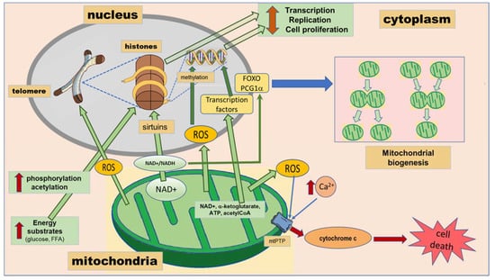 | Mitochondria | Crosstalk with nucleus: -Leaves epigenetic markers through the generation of metabolites by the tricarboxylic acid cycle [17,18,19]. -Regulates mitochondrial biogenesis through acetylation of FOXOs and PCG-1α [17,18,19]. | -neurodegenerative diseases: Alzheimer’s disease [20]. | |