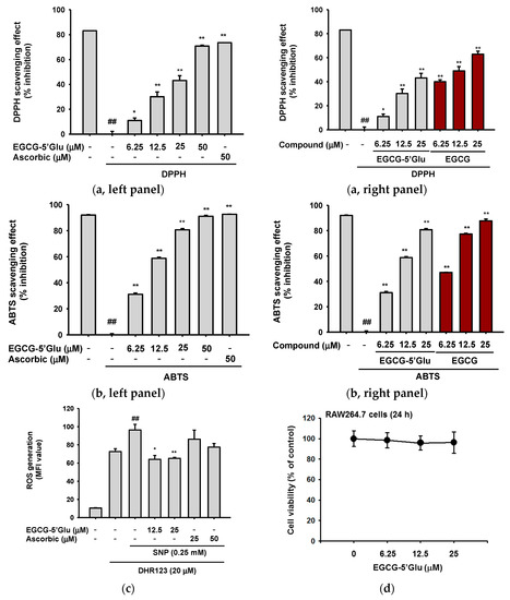 Antioxidant effect of EGCG-5′Glu. 250 mM DPPH solution was incubated with EGCG-5′Glu (0–25 μM), ascorbic acid (50 μM) (a, left panel), or EGCG (0–25 μM) (a, right panel) at 37 °C for 30 min. Absorbance at 517 nm was measured by spectrophotometry. Ascorbic acid was used as a positive control. Mixture of 2,2'-azino-bis(3-ethylbenzothiazoline-6-sulphonic acid (ABTS) solution and EGCG-5′Glu (b, left panel) or EGCG (b, right panel) was reacted at 37 °C for 30 min. Scavenging of ABTS was determined by measuring absorbance at 730 nm. Ascorbic acid was used as positive control. (c) DHR123 was treated on RAW264.7 cells for 10 min, and EGCG-5′Glu or ascorbic acid were then added. Cells were incubated with sodium nitroprusside (SNP) for 20 min, and reactive oxygen species (ROS) generation was determined by fluorescence-activated cell sorting (FACS). Ascorbic acid and EGCG were used for a positive control in DPPH assay, ABTS assay, and ROS generation experiment. (d) Cytotoxicity of EGCG-5′Glu on RAW264.7 cells was tested by MTT assay. ## p < 0.01 versus a normal group (untreated group), * p < 0.05 and ** p < 0.01 versus a control group (induced group).