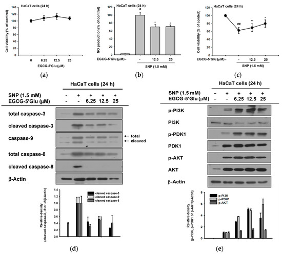 Anti-apoptotic effect of EGCG-5′Glu under SNP-induced apoptosis. (a) EGCG-5′Glu was applied to HaCaT cells for 24 h. Cell viability was tested by MTT assay. (b) EGCG-5′Glu was pre-treated on RAW264.7 cells for 30 min, and SNP (1.5 mM) was added for 24 h. SNP-derived NO was measured by Griess assay. (c) Under SNP treatment, cell viability of HaCaT cells with or without EGCG-5′Glu was identified by MTT assay. (d) Caspase levels of EGCG-5′Glu and SNP-treated HaCaT cells were analyzed by immunoblotting. Antibodies against total or cleaved caspase-3, -8, and -9 and β-actin were used. (e) Phosphorylated levels of PI3K, PDK1, and AKT in EGCG-5′Glu- and SNP-treated HaCaT cells were analyzed by immunoblotting. Antibodies against phospho- or total forms PI3K, PDK1, AKT, and β-actin were used. # p < 0.05 and ## p < 0.01 versus a normal group (untreated group), * p < 0.05 and ** p < 0.01 versus a control group (SNP-treated group).