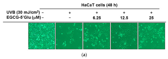 HaCaT cells were seeded at 7 × 105 cells per well in 6-well plates and incubated to 24 h of starvation using serum-free minimal essential medium (MEM). Before UVB irradiation, HaCaT cells were pretreated with EGCG-5′Glu for 30 min. Then, HaCaT cells were washed with DPBS and exposed to 30 mJ/cm2 of UVB irradiation (UVB lamp: Bio-link crosslinker (BLX)-312; Vilber Lourmat, Collegien, France). After UVB irradiation, DMEM medium containing EGCG-5′Glu (0–25 μM) was added to cells and incubated for 24 h.