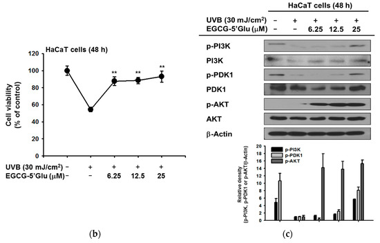 Anti-oxidant effect of EGCG-5′Glu against UVB-induced damage. (a) Images of HaCaT cells treated with EGCG-5′Glu (0–25 μM) and UVB (30 mJ/cm2) irradiation for 48 h were captured with a camera attached to the microscope. (b) Under UVB irradiation, viability of HaCaT cells with and without EGCG-5′Glu was measured by MTT assay. (c) Under UVB irradiation, HaCaT cell were incubated with EGCG-5′Glu for 48 h. Phospho- and total PI3K, AKT, and PDK1 expression was detected by immunoblotting. β-Actin was used as an immunoblotting loading control. ** p < 0.01 versus a control group (UVB-treated group).
