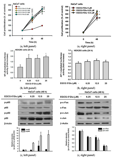 HEK293 cells were seeded at 1 × 104 cells per well in 24-well plates. After 24 h, cells were transfected with NF-κB-Luc, AP-1-Luc, and β-galactosidase with media not containing antibiotics for 24 h. PEI was used as transfection reagent. Cells were treated with EGCG-5′Glu (0–25 μM) for 24 h. Luciferase assay was conducted using the Luciferase Assay System (Promega, Madison, WI, USA).