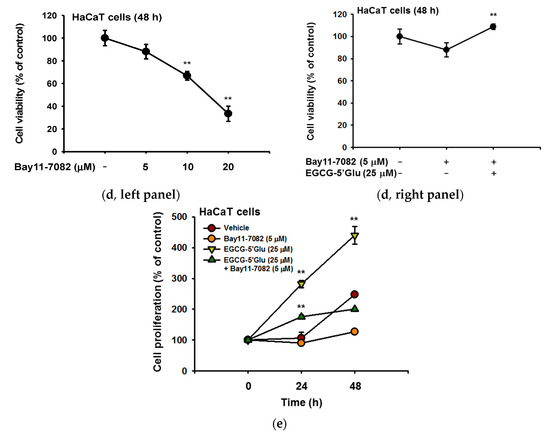 Previous data have confirmed that EGCG-5′Glu aids cell growth of UVB-irradiated HaCaT cells. Next, a cell proliferation assay was conducted to investigate improvement in skin wrinkles with EGCG-5′Glu. Increased proliferation of cells has been thought a strategy of anti-wrinkle [38,39]. With EGCG-5′Glu treatment, cell proliferation compared to the normal group increased 309.2% (EGCG-5′Glu 3.125 μM), 312.2% (EGCG-5′Glu 6.25 μM), 288% (EGCG-5′Glu 12.5 μM), and 311.1% (EGCG-5′Glu 25 μM) at 48 h (Figure 5a, left panel). To confirm such an increasing pattern, we also carried out counting viable cells using Trypan blue dye exclusion assay. As shown in Figure 5a, the right panel showed, EGCG-5′Glu (6.25 and 12.5 μM) significantly increased the number of cells. Because cell proliferation was increased with EGCG-5′Glu treatment, a reporter gene assay was next performed to investigate the mechanism. NF-κB luciferase activity increased 1.8 fold (EGCG-5′Glu 6.25 μM and 12.5 μM) and 1.95 fold (EGCG-5′Glu 25 μM) (Figure 5b). Immunoblotting was performed to determine the effect of EGCG-5′Glu on NF-κB and AP-1 signaling. In HaCaT cells, treatment with EGCG-5′Glu dramatically increased the level of phospho-p50 in a dose-dependent manner. p65 activity was slightly regulated (Figure 5c, left panel), but the levels of phospho- c-Jun and c-Fos were not affected (Figure 5c, right panel). To prove the effect of NF-κB on cell proliferation, Bay11-7082 was used as an NF-κB inhibitor. The cytotoxicity of Bay11-7082 was confirmed in HaCaT cells (Figure 5d, left panel), and 5 μM Bay11-7082 was used in subsequent experiments. When EGCG-5′Glu was treated with Bay11-7082, cell viability was higher than in the NF-κB alone group (Figure 5d, right panel). Cell proliferation rate for 48 h was also higher with Bay11-7082 and EGCG-5′Glu than with Bay11-7082 alone (Figure 5e). These results demonstrated that EGCG-5′Glu regulates cell proliferation and has ability to improve skin wrinkle formation.