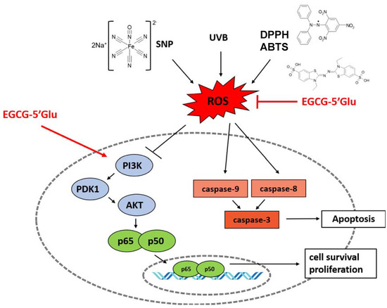 Summary of the cytoprotective effect of EGCG-5′Glu. EGCG-5′Glu cleared various free radicals and downregulated caspase activities. Survival signal pathway (PI3K/AKT/NF-κB) improved with EGCG-5′Glu, and cell proliferation increased. → stimulation, ⊥ inhibition.