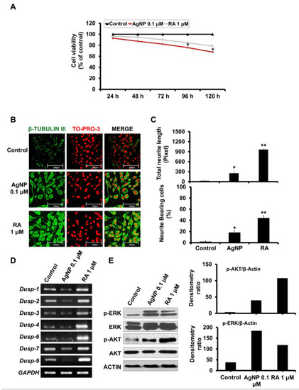 2.4. A ROS Scavenging Agent and ERK and AKT Inhibitors Have Differential Effects on AgNP- and RA-Induced Neuronal Differentiation