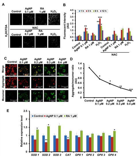 2.3. AgNP and RA Treatment Have Differential Effects on Intracellular ROS Generation, Mitochondrial Membrane Depolarization, and Antioxidant Gene Expression