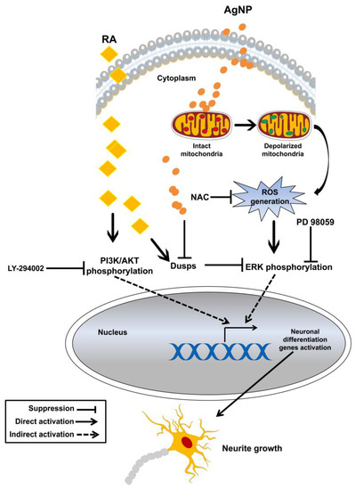 - Dayem, A.A.; Kim, B.; Gurunathan, S.; Choi, H.Y.; Yang, G.; Saha, S.K.; Han, D.; Han, J.; Kim, K.; Kim, J.H. Biologically synthesized silver nanoparticles induce neuronal differentiation of SH-SY5Y cells via modulation of reactive oxygen species, phosphatases, and kinase signaling pathways. Biotechnol. J. 2014, 9, 934–943. [Google Scholar] [CrossRef] [PubMed]