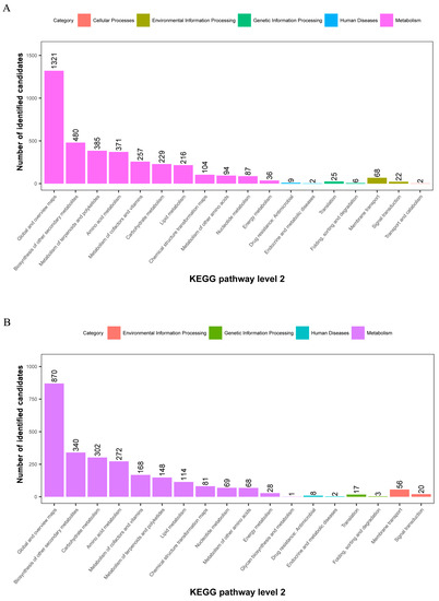 KEGG pathway classification: metabolites detected and annotated. (A) POS model; (B) NEG model. The x-axis represents level-2 terms of the KEGG pathway and the y-axis represents the number of metabolites identified.