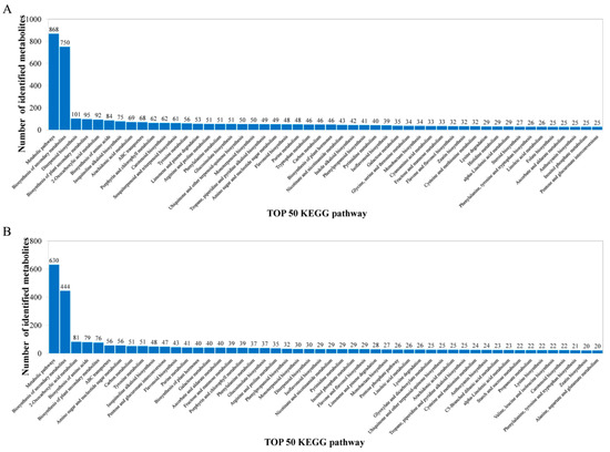 Identified metabolites classified into the top 50 KEGG pathways. (A) POS model; (B) NEG model. The x-axis represents the top 50 KEGG pathways and the y-axis represents number of identified metabolites involved in this pathway.