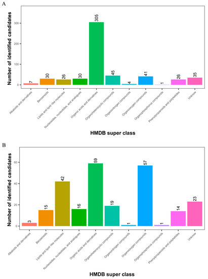 Identified metabolites from level-two identification were classified into 11 HMDB super classes. (A) POS model; (B) NEG model. The x-axis represents HMDB super classes, and the y-axis represents the number of identified metabolites.