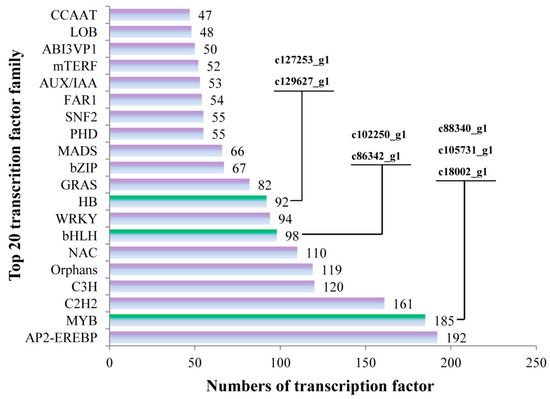 The numbers of transcription factors involved in the top 20 transcription factor families. The x-axis represents the numbers of transcription factors and the y-axis represents the top 20 transcription factor families.
