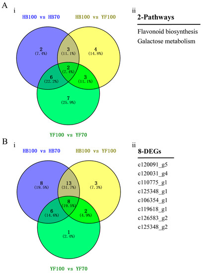 Identification of candidate DEGs. (A) Venn Diagram of pathways. (i) indicates Venn Diagram result between three groups, HB100 vs. HB70, HB100 vs. YF100, and YF100 vs. YF70. (ii) indicates the two specific pathways; (B) Venn Diagram of DEGs involved in flavonoid biosynthesis. (i) indicates Venn Diagram result between three groups, HB100 vs. HB70, HB100 vs. YF100, and YF100 vs. YF70. (ii) indicates specific 8 DEGs.
