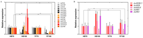 Expression profiles of structural and regulatory genes involved in flavonoid biosynthesis in the flesh of “HB” and “YF”. (A) 14 structural genes; (B) 5 regulatory genes. The x-axis represents two different development stages of “HB” and “YF”, and the y-axis represents relative expression. Data were analyzed using the t-test. * p < 0.05, ** p < 0.01.