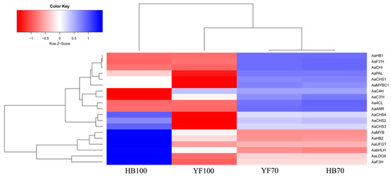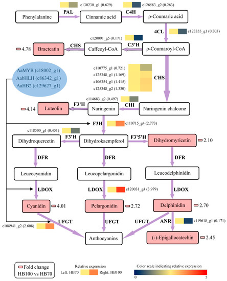 In order to better understand the relationship between metabolites and genes in flavonoid biosynthesis, all results of metabolites and genes were combined to establish a network, aiming to show the relationship between gene expression and metabolite accumulation more intuitively (Figure 10). Among the 14 structural genes, AaF3H, AaLDOX and AaUFGT were highly expressed in HB100 vs. HB70 in comparison with the other 11 structural genes. The 7 metabolites with significant differences in HB100 vs. HB70 of flavonoid biosynthesis were: bracteatin, luteolin, dihydromyricetin, cyanidin, pelargonidin, delphinidin and (−)-epigallocatechin. It is generally known that transcription factor plays a role by binding the promoter of structural genes. Therefore, we speculate the hypothesis that the three transcription factors AaMYB, AabHLH, and AaHB2 activate expression of AaF3H, AaLDOX and AaUFGT by binding the promoter of these three structural genes, inducing the accumulation of the 7 metabolites described above in flavonoid biosynthesis. Specifically, AaMYB, AabHLH, AaHB2, AaF3H, AaLDOX and AaUFGT were the candidate genes obtained from this study and could be used for further study, revealing the red mechanism of A. arguta.