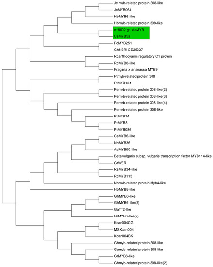Phylogenetic analysis of 40 MYB transcription factor genes in different species. The green frame indicates that the two genes AaMYB and CsMYB5a are clustered together.