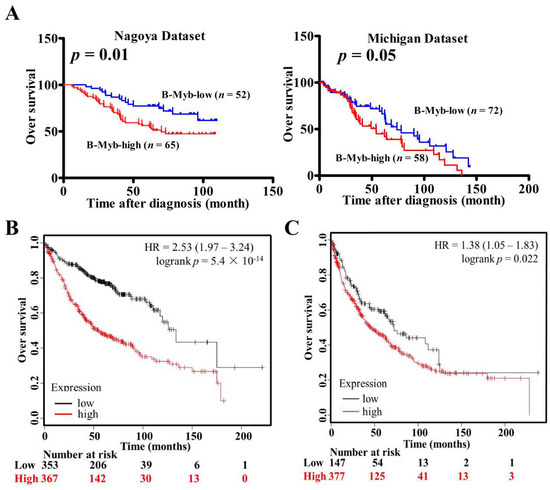 We previously found that B-Myb was upregulated in non-small-cell lung cancer (NSCLC). Moreover, the expression level of B-Myb was positively associated with tumor pathological grade, clinical stage, tumor, node, metastasis (TNM) classification, and lymph node metastasis [20]. In this study, we aimed at evaluating the prognostic value of B-Myb expression in silico using published microarray data, which are from primary tumors of lung cancer patients with follow-up information. As shown in Figure 1A, high expression of B-Myb was strongly associated with poor overall survival of lung cancer patients in the Nagoya University lung adenocarcinoma (ADC) cohort and Michigan University lung squamous cell carcinoma (SQCC) cohort (p < 0.05). In consistency with this observation, as shown in Figure 1B,C, online Kaplan–Meier plotter analysis [29] also revealed that B-Myb overexpression was negatively related to significant improvement in patient survival rates in lung ADC and SQCC. Moreover, univariate analyses revealed that high B-Myb expression was significantly associated with poorer survival in both cohorts (hazard ratio (HR) = 1.870, 95% confidence interval (CI) = 1.024–3.416, p = 0.042). Multivariate Cox regression analysis displayed that B-Myb expression was an independent prognostic factor for the Nagoya University cohort (HR = 1.789, 95% CI = 0.974–3.286, p = 0.043). In addition, lymph node metastasis was significantly related to poorer survival (p = 0.003) and the independent prognostic factor (p = 0.002) for the Nagoya University cohort (Table 1).