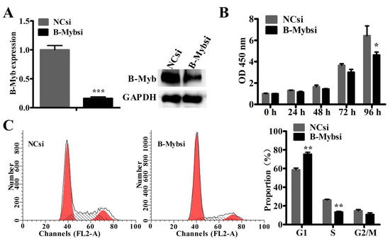 B-Myb depletion affects cell cycle progression and inhibits proliferation in A549 lung cancer cells. (A) A549 cells of small interfering RNA (siRNA)-mediated B-Myb silencing were transiently transfected with the negative control (NCsi) and B-Myb siRNA (B-Mybsi), respectively. Forty-eight and seventy-two hours after transfection, total RNA and whole cell lysates were respectively prepared and subjected to qRT-PCR and Western blot, and glyceraldehyde-phosphate dehydrogenase GAPDH as control proteins. (B) B-Myb depletion reduced cell proliferation. A549 cells were transiently transfected with negative control or B-Myb siRNA, and cell proliferation was then determined by cell counting kit-8 assay kits (CCK8) at the indicated time points. (C) B-Myb depletion delays G1–S phase transition. A549 cells were seeded on six-well plates and transfected with the indicated siRNAs, and twenty-four hours later, cells were collected and subjected to cell cycle analysis. All experiments were performed in triplicates. Data represent the mean ± standard deviation (SD). * p < 0.05, ** p < 0.01, *** p < 0.001.