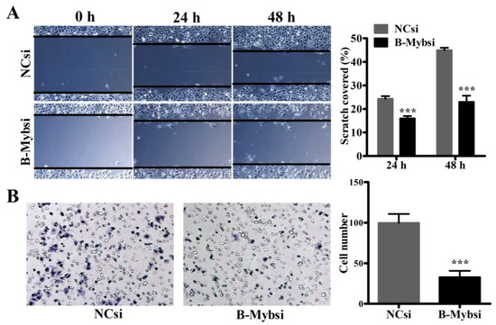 B-Myb knockdown inhibits motility in A549 lung cancer cells. A549 cells were transiently transfected with the negative control and B-Myb siRNA and then subjected to (A) would healing assay and (B) transwell migration assay as described in Materials and Methods section, respectively. Representative images (×200) (left) and quantification results (right) were shown for each assay. All experiments were performed in triplicates. Data represent the mean ± standard deviation (SD). *** p < 0.001.