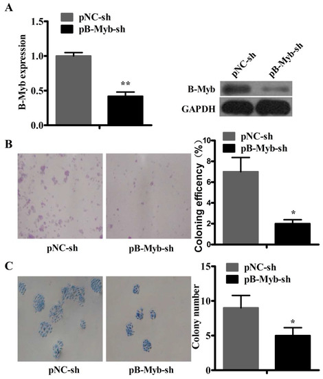 Empty vector plasmids (pSuper-retro-sh) had been preserved in our laboratories, and short hairpin RNA (shRNA) was synthesized by Sangon Biotech (Shanghai, China) according to the sequence of control-siRNA or B-Myb-siRNA. The sequences of the siRNA used were listed in Materials and Methods, Section 4.2. Annealing shRNA was inserted into pSuper-retro-sh via enzyme digestion. Through transformation, selection, and plasmid extraction, the plasmids of negative control and silencing B-Myb gene were constructed well, and were named pControl-sh and pB-Myb-sh. H1299 cells seeded into 6-well plates were transiently transfected with 2 μg of these plasmids using Lipofectamine 2000 reagent (Invitrogen) according to the manufacturer’s instructions. After 6 h, the cells were seeded into 96-well plates at a density of about one cell per well and selected in the presence of 1.3 µg/mL puromycin for generating the control and stably silencing B-Myb clones. The survived puromycin-resistant cell clones were then continuously expanded and confirmed to construct the corresponding stable cell lines.