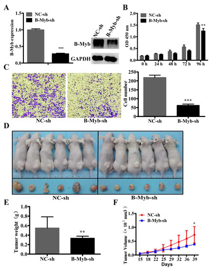 To examine whether silencing of B-Myb expression could inhibit tumorigenesis in vivo, we used A549 cells to establish stable cells with lentiviral particle B-Myb knockdown. Quantitative RT-PCR and Western blot analyses confirmed that the B-Myb expression was significantly decreased at both the mRNA and protein levels in the stable B-Myb knockdown cells (Figure 5A). In consistency with the results observed in the siRNA-mediated B-Myb depletion system, stable B-Myb knockdown also significantly decreased cell growth and motility in the lentivirus-mediated B-Myb depletion system, as evidenced by proliferation (Figure 5B) and transwell migration assays (Figure 5C). Subsequently, the stable B-Myb knockdown and the negative control cells were injected subcutaneously into the dorsal flank of nude mice, respectively. As shown in Figure 5D–F, stable knockdown of B-Myb expression remarkably suppressed the tumor growth in both tumor volume and tumor weight in the nude mice.