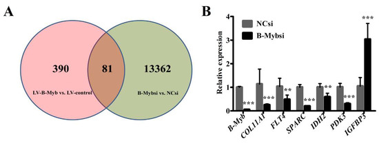 B-Myb knockdown affects various downstream genes and important pathways. (A) Venn diagram showing the distribution of DEGs that are unique or common between the two comparisons: LV-B-Myb vs LV-control H1299 cells [20] and B-Mybsi vs NCsi H1299 cells. (B) Validation of DEGs by qRT-PCR. qRT-PCR experiments were performed in triplicates. Data represent the mean ± SD. ** p < 0.01, *** p < 0.001.