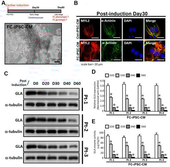 Previous study demonstrated that patient-derived iPSCs chronologically exhibit typical characteristics of cardiomyopathy, such as familial hypertrophic cardiomyopathy (FHC), after a defined period of cardiac differentiation []. We sought to investigate whether FC-iPSC-CMs also chronologically recapitulate the pathophysiological characteristics of Fabry-specific cardiomyopathy. Ctrl and FC-iPSCs with established pluripotent features were further assigned for cardiac induction. After the cardiac differentiation, these differentiated cardiomyocytes (FC-iPSC-CMs) all exhibited CM-like phenotypes (Figure 2A) and the expression of cardiac-specific markers, including α-actinin and MYL2, at post-induction 30 days (Figure 2B). Comparing with Ctrl-iPSC-CMs, the microscopic examination of all FC-iPSC-CMs revealed remarkable cellular hypertrophy, as described previously [,]. Moreover, during differentiation, the mRNA and protein expression levels of GLA (Figure 2C,D), as well as the enzyme activity of GLA (Figure 2E), were all declined and reached the maximal decrease at day 60 post-induction. Collectively, these data indicated to the recapitulation of cardiac hypertrophy and GLA enzymatic decrease in patient-derived FC-iPSC-CMs.