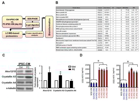 Alox12/15 as the most upregulated factor in FC-iPSC-CMs. (A) Schematic diagram of the MS-based proteomics, showing how candidate markers were identified in FC-iPSC-CMs. (B) Proteome screening of the significantly upregulated candidate markers in FC-iPSC-CMs. (C) Western blotting (left) and its quantification (right) confirmed the upregulation of Alox12/15 in FC-iPSC-CMs. (D) Elevated secretion of 12(S)-HETE and 15(S)-HETE from FC-iPSC-CMs. In (C,D), the results are mean ± S.D. of three independent experiments. In (C), * p < 0.05 vs. Ctrl; in (D), * p < 0.05 vs. Ctrl-iPSC-CM and hESC-CM.