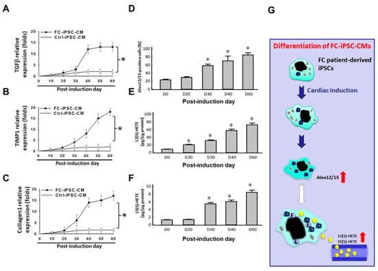 Elevation of fibrotic markers and the secretion of 12(S)-HETE and 15(S)-HETE during the differentiation course. mRNA expression levels of (A) TGFβ, (B) TIMP-1, and (C) collagen 1 in FC-iPSC-CMs and Ctrl-iPSC-CM at indicated time points after the induction of myocardial differentiation. (D) Immunofluorescence indicated the increased amount of Alox12/15-positive cells during the induction course. Elevated secretion of (E) 12(S)-HETE and (F) 15(S)-HETE from FC-iPSC-CMs. (G) The Scheme showing the upregulation of Alox12/15 and elevated secretion of its metabolites during the differentiation course. Red up arrows indicated the elevated levels of Alox12/15 and its metabolites. In (A–E), the results are mean ± S.D. of three independent experiments. In (A–C), * p < 0.05 vs. D60 in Ctrl-iPSC-CMs; in (D–F), * p < 0.05 vs. D0, D: Day.